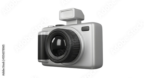 A silver digital camera with a built-in flash, presented against a plain white background.