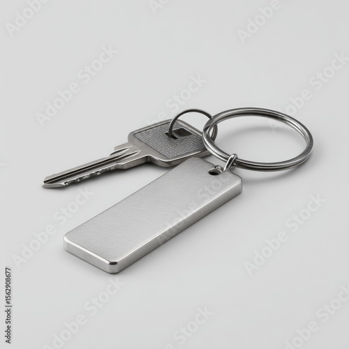 A silver key and rectangular keychain lie on a light gray surface. The keychain is blank, metallic, and attached to a simple metal ring