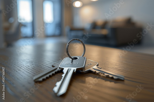 A silver key is sitting on a wooden table