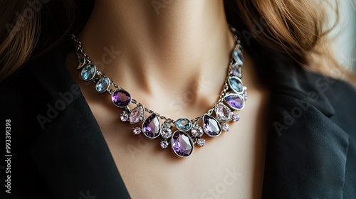 A silver necklace with shimmering amethyst and aquamarine gemstones worn by a stylish woman, with soft lighting highlighting the necklace's details.