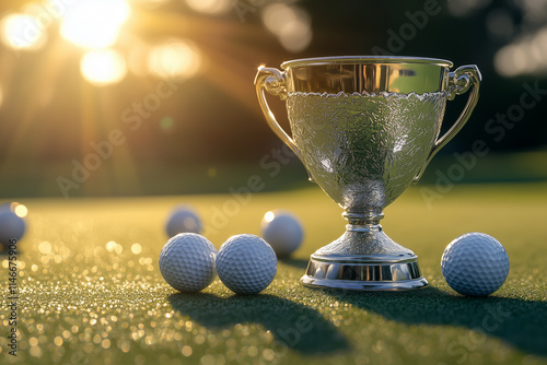 A silver trophy cup with a subtle golf ball texture is placed centrally on a clean green surface.
