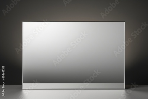 A silver-framed empty magnetic cardboard box with copy space on blank labels for customization, set against a mirrored silver background. Empty blank label cardboard Box.