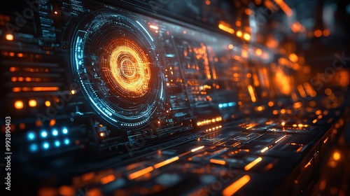 A similar 3D rendering of a technology product display with glowing sci-fi elements, focusing on futuristic digital interfaces and data connections.