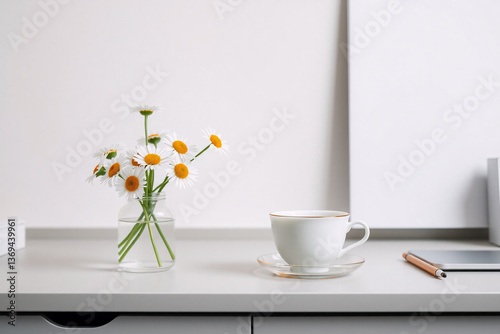 A simple and bright still life composition featuring a glass vase with white daisies, a white teacup with saucer, and a pen on a clean white desk against a white wall in an indoor setting.