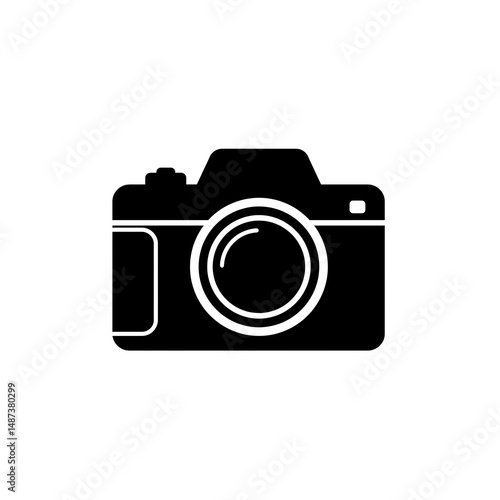 A simple black silhouette icon of a digital camera (DSLR or mirrorless style) viewed from the front, highlighting the lens. Ideal for photography or media-related themes.
