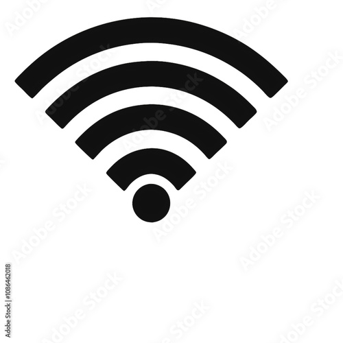 A simple, black Wi-Fi signal icon with curved, evenly spaced bars symbolizing connectivity and a central circular dot, set against a transparent background