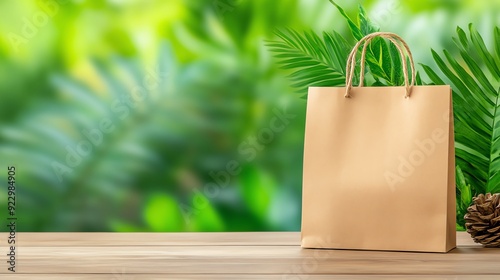 A simple brown paper bag on a wooden table surrounded by lush greenery, perfect for eco-friendly shopping and lifestyle themes. Buying green Concept.
