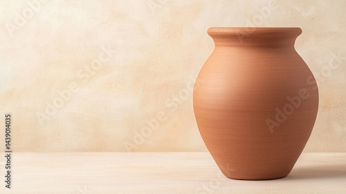 A simple clay pot stands against a textured beige background, showcasing its earthy tones and traditional craftsmanship.