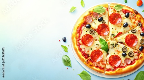 A simple clipart of a pizza with pepperoni and olives, with space for promotional content on a clean background.