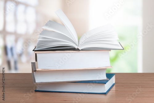 A simple composition of many books, stack or pile of books on wooden table concept