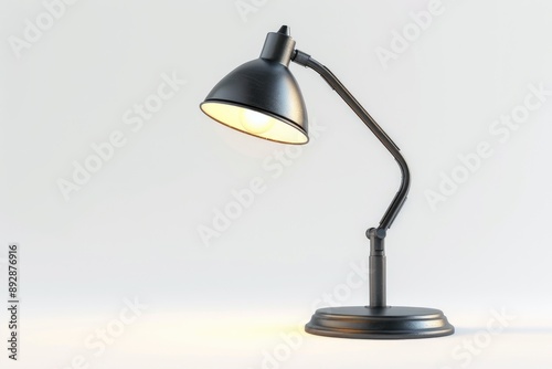 A simple desk lamp with a black shade placed on a clean white background