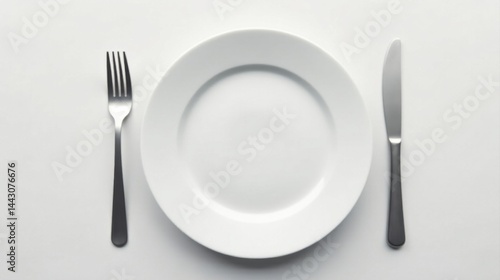 A simple, elegant place setting featuring a pristine white dinner plate, a sleek silver fork, and a matching knife, ready for a meal.