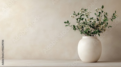 A simple, elegant vase with white flowers sits on a wooden surface against a soft, neutral background.