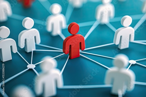 A simple graphic depicting interconnected people, symbolizing a network and collaboration, with one person in red standing out among the white figures on a blue background.