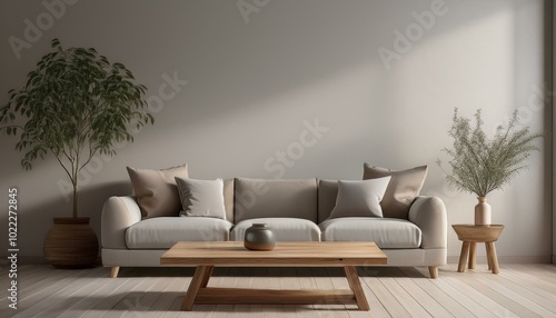 a simple grey couch, a light wood coffee table, and a large empty wall behind the seating ar