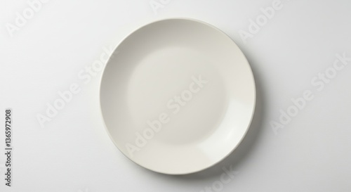 A simple overhead shot of a plain white ceramic plate on a neutral white surface studio background