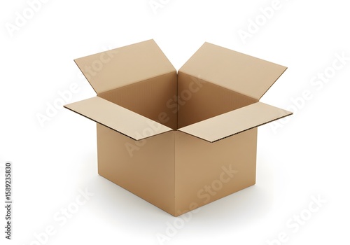 A simple studio shot of an open brown cardboard box on a white background with soft shadows around it