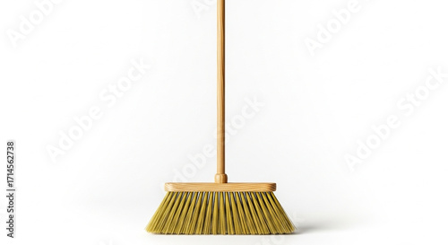 A simple, sturdy push broom with a light-colored wooden handle and olive-green bristles stands against a white background.