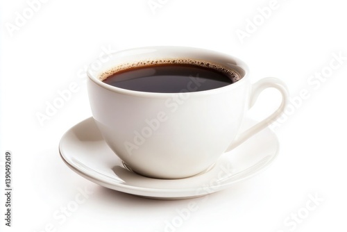 A simple white cup of black coffee sitting on a matching saucer against a white background studio shot