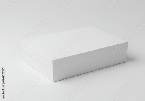 A simple white rectangular box sitting on a white surface in a studio setting with soft shadows