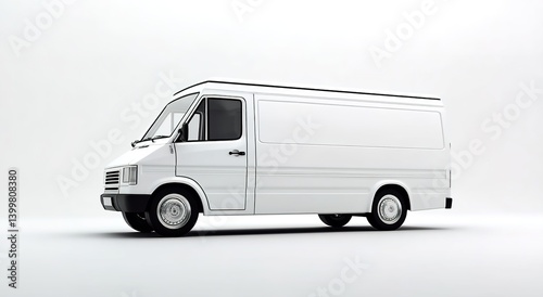 A simple white van with clean-cut body lines, side view showing wheels and windows, minimal antenna, pure-color background