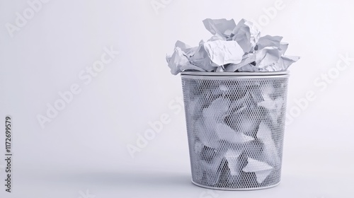 A simple wire mesh trash can filled with crumpled paper on a white background