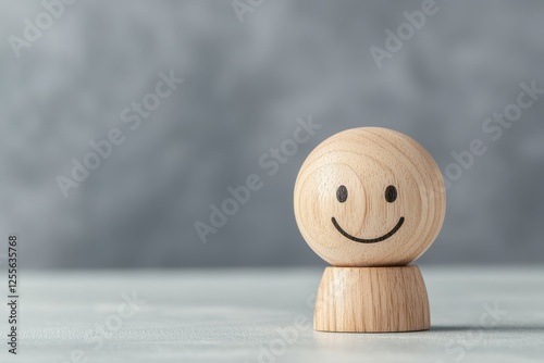 A simple wooden figure with a smiling face, set against a textured gray background, exuding a positive and cheerful vibe.