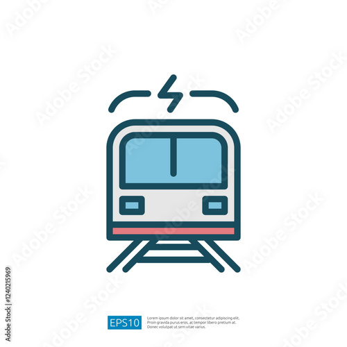A simplistic graphic representation of a train, featuring a front view with tracks beneath it, designed in a modern style for transportation-related contexts.