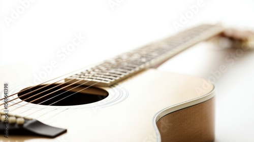 A single acoustic guitar isolated on white, showcasing detailed craftsmanship in a studio setting.