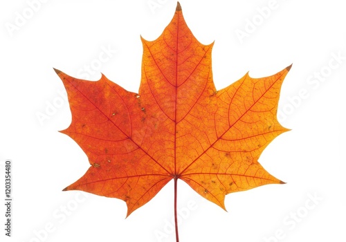 A single autumn maple leaf with vibrant red and orange hues isolated on white background