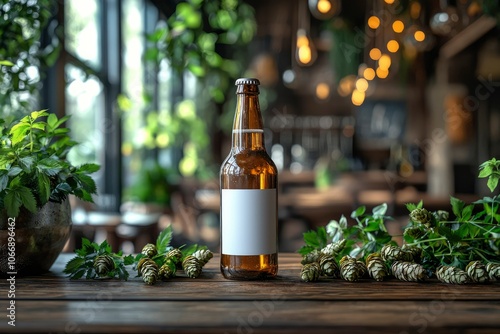 A Single Beer Bottle with Hop Cones on a Wooden Table