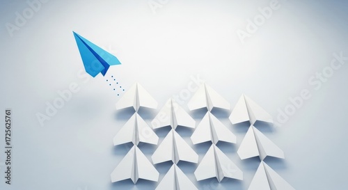 A single blue paper airplane soars ahead of a group of white paper airplanes, symbolizing leadership and innovation.