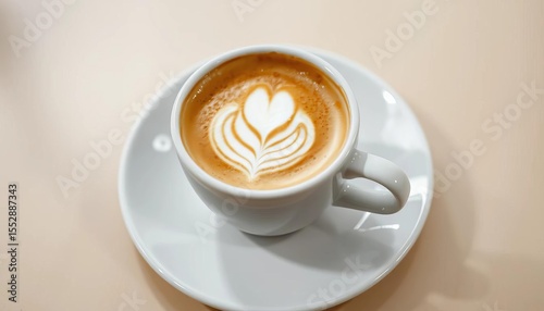 A single cappuccino in a white cup, latte art visible, rests on a white saucer, energy, hot