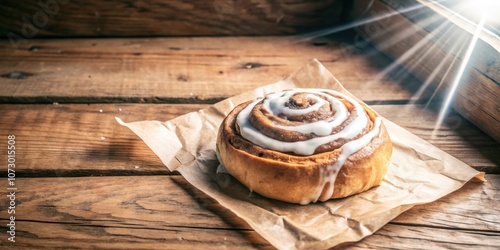 A single cinnamon roll sits on parchment paper, bathed in the warm glow of a window's sunlight, ready to be savored.