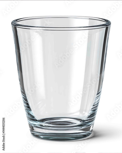 A single clear glass cup transparent with realistic light reflections smooth curved shape no shadow isolated on a pure white background Created Using product rendering style photore