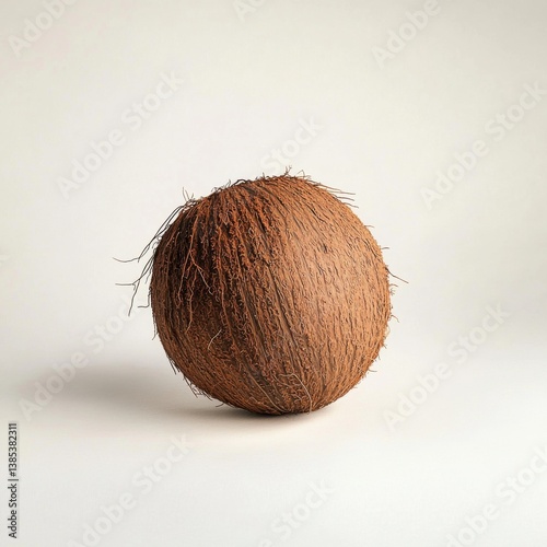 A single coconut in close-up, isolated on a white background. Featuring rough texture and tropical appeal