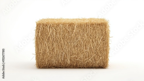 A single compressed straw bale with rough textures set on a clean white background for a minimalist agricultural theme.