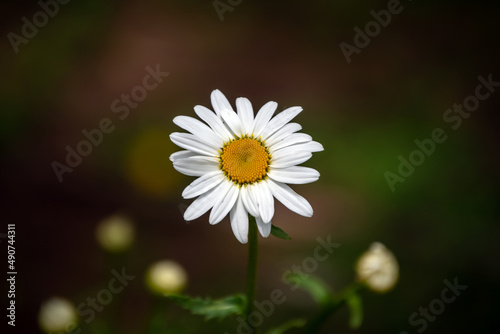 A single daisy has open petals. The nearby daisy buds are highly defocused creating a slight glow effect.