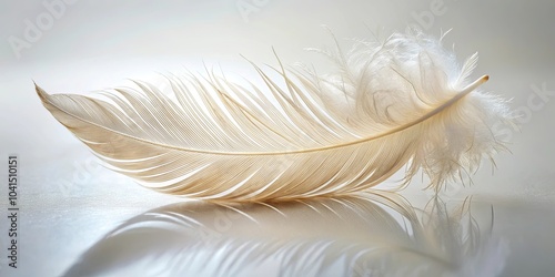 A single delicate feather rests on a smooth surface, its intricate pattern and soft texture reflected in a subtle sheen.