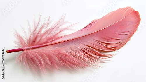 A single, delicate pink feather laying gracefully against a white background, showcasing its fine detail and soft texture.