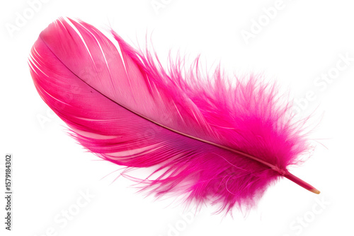 A single delicate pink feather with fluffy barbs rests on a plain transparent background