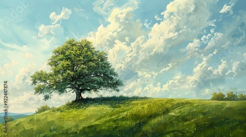 A single elder tree stands on a bright green hilltop, beneath a serene sky with soft, fluffy clouds, symbolizing solitude and tranquility in harmonious acrylic shades.