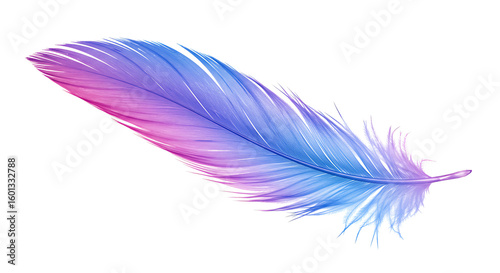A single feather with a gradient of purple and blue hues isolated on a plain white background created with generated ai
