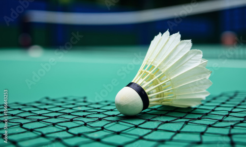 A Single Feathered Shuttlecock Resting on the Net of a Badminton Court