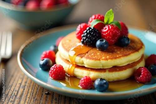 A single fluffy pancake topped with fresh mixed berries and drizzled with syrup, plate, dessert