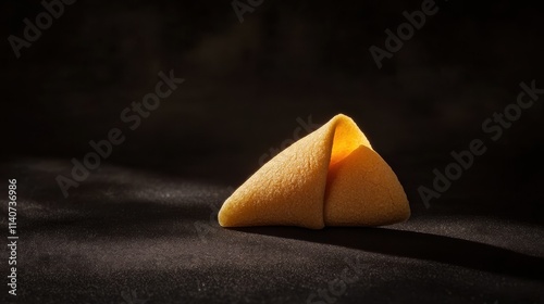 A single fortune cookie isolated on a black background, illuminated by a soft spotlight for dramatic contrast