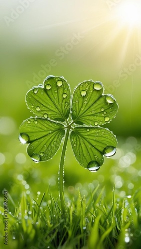 A single four-leaf clover surrounded by dewdrops on fresh green grass, with soft sunlight filtering through. The 4K resolution highlights the delicate details of the clover and the sparkling dew
