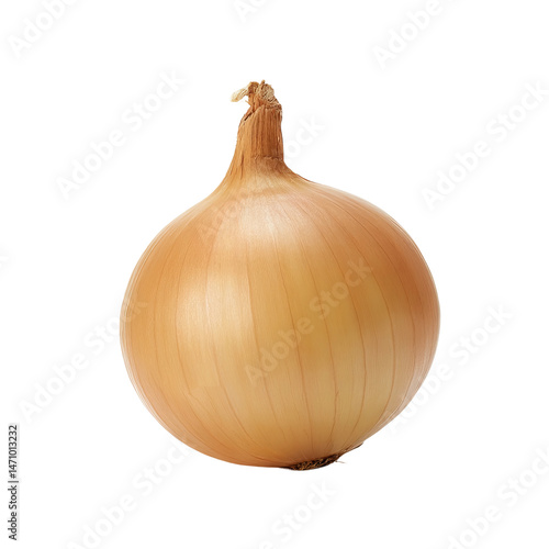 A single, fresh onion, ready for culinary use. The onion has a smooth, tan outer skin