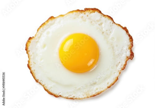 A single fried egg with a bright yellow yolk and crispy white edges on a plain white background is shown