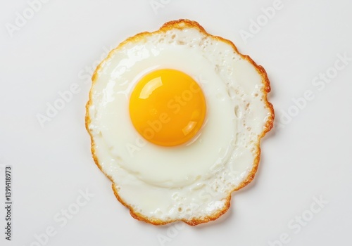 A single fried egg with a bright yellow yolk on a white background with a crispy edge detail shot
